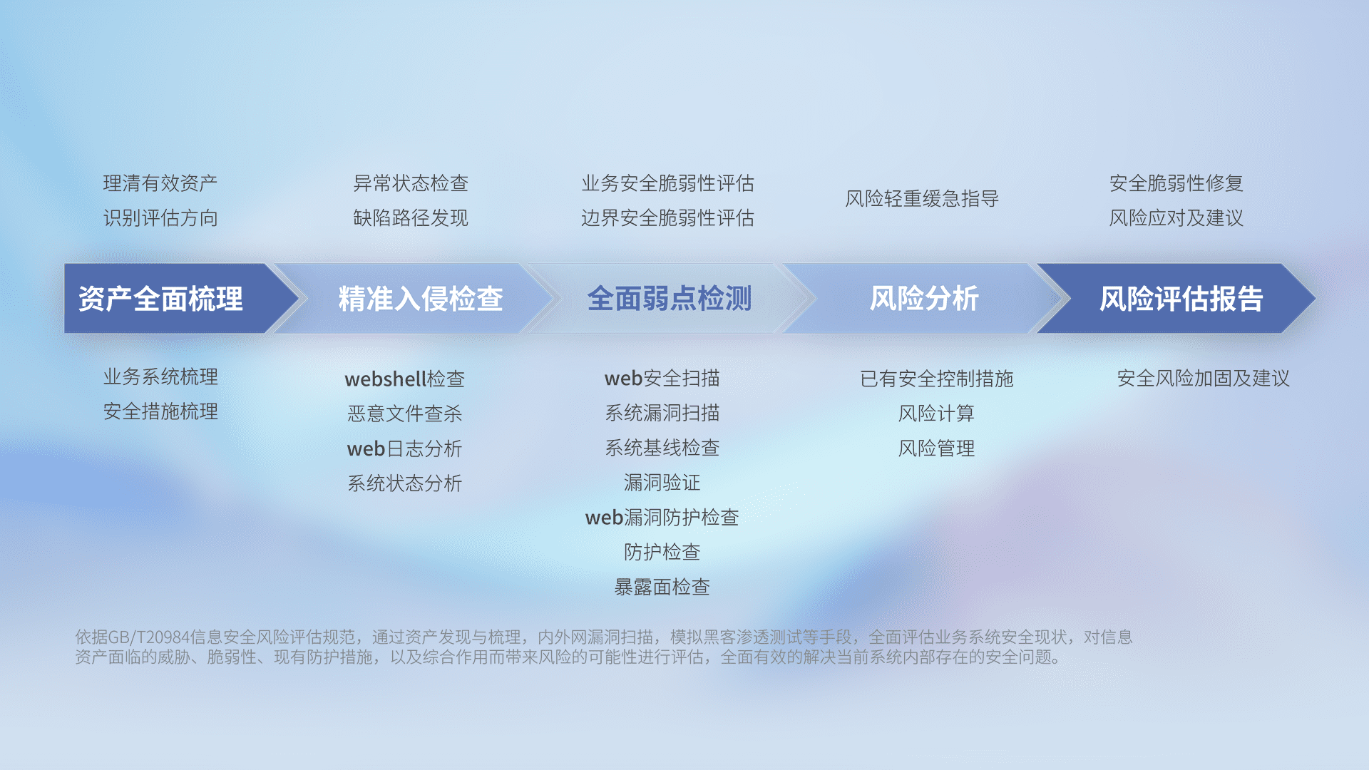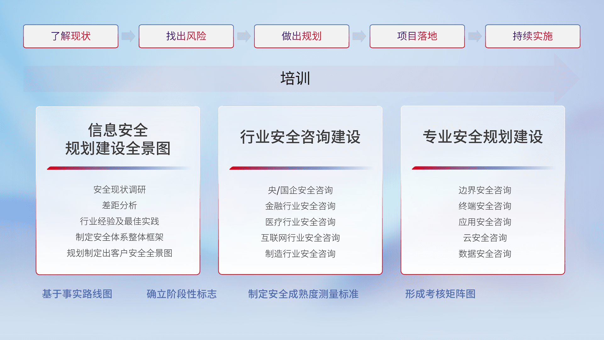 针对客户行业特性,,,,以专业的安全服务+多厂商联合解决方案提供专属的一站式安全管理服务,,,,帮助客户全面感知网络空间威胁,,,基于识别、、检测、、、分析、、防护、、、监测、、、、响应的服务理论模型,,,从方案咨询、、集成交付、、评估验证、、优化加固、、、运维运营,,,致力于为客户提供完整的闭环管理式安全服务。。。以实战经验为客户打造高抵御风险的安全体系,,,,帮助客户发现威胁、、、对抗威胁、、处置威胁,,不断积累安全对抗能力,,持续保障数字化安全。。。